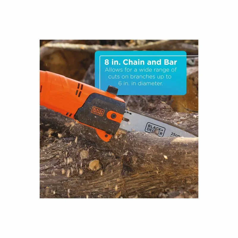 BLACK+DECKER 20-volt cordless lithium pole saw. In-line power-head allows easy maneuverability and viability between branches. Unit disassembles for easy storage and transport. Lightweight design makes it easy to use. Replacement chain RC800.