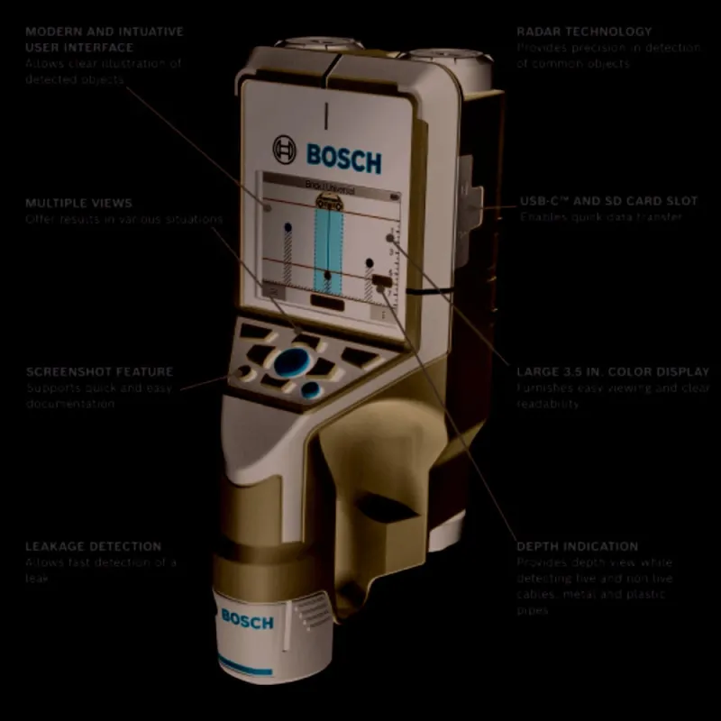 This wall and floor scanner features radar technology, which is accurate and reliable, indicating the correct material. The Bosch D-TECT200C 12V Max Wall/Floor Scanner delivers advanced precision. Not just a stud finder, it detects live and non-live cables, rebar, metal, plastic pipes and wooden studs, with depth indication of the object. It has leakage detection, which allows fast discovery of a leak. The scanner’s screenshot feature supports quick-and-easy documentation. It can be saved and transferred to a computer for further analysis. The product software can be updated remotely. The USB-C™ and SD card slot enables quick data transfer. The spot view delivers fast results and measurements in small places to scan (such as corners), and the scanner provides about a 7-1/2 In. measuring depth to detect even deep objects. The 3.5 In. color display provides clear readability, and the user interface is intuitive, providing clear illustration of detected objects. It runs on Bosch 12V Max Li-ion batteries for outstanding runtime.