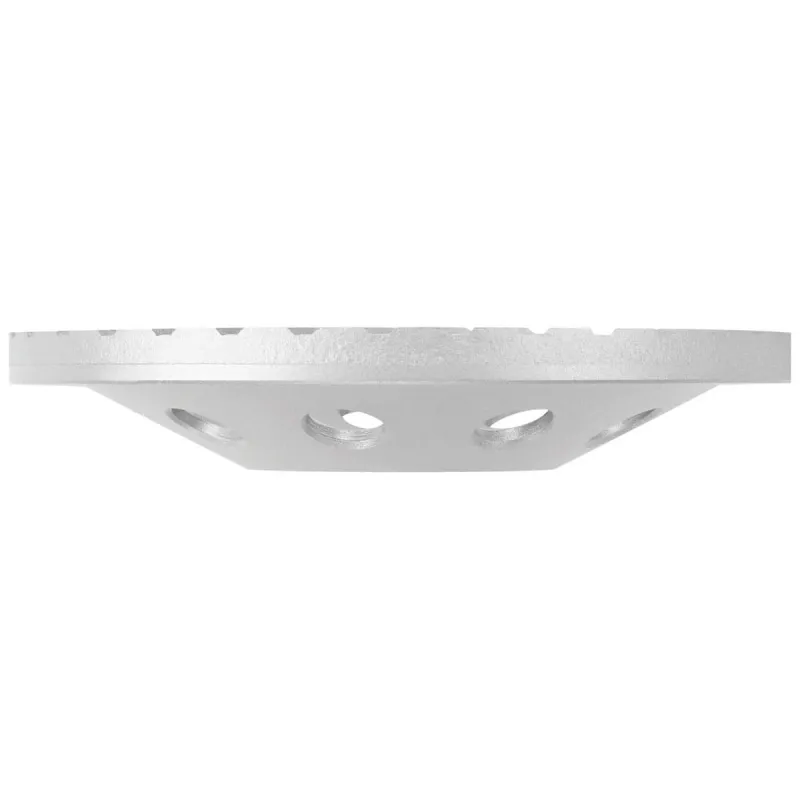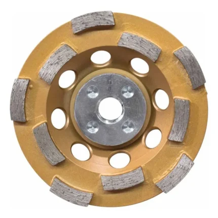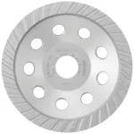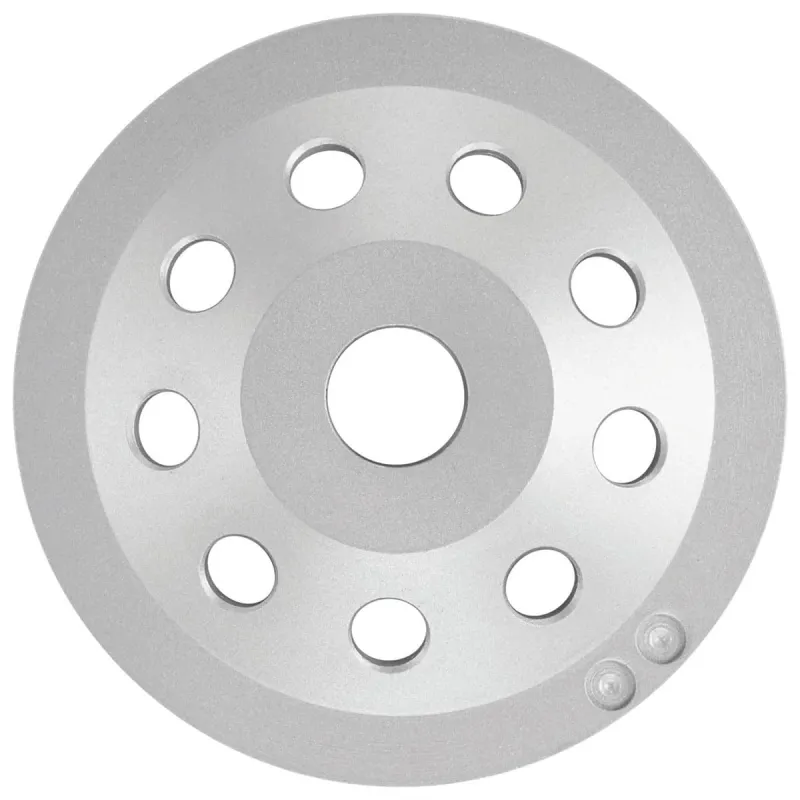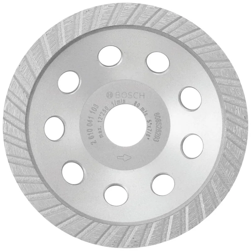 The Bosch Turbo Diamond Cup Wheel provides controlled material removal and a smooth final grind for concrete. Holes in the steel body were added to aid dust control. The wheel itself is precision balanced for less vibration and a better grind. The wheel is more durable than bonded abrasive wheels for concrete and masonry applications. It features a 7/8 In. arbor for use with a Bosch concrete surface grinder.