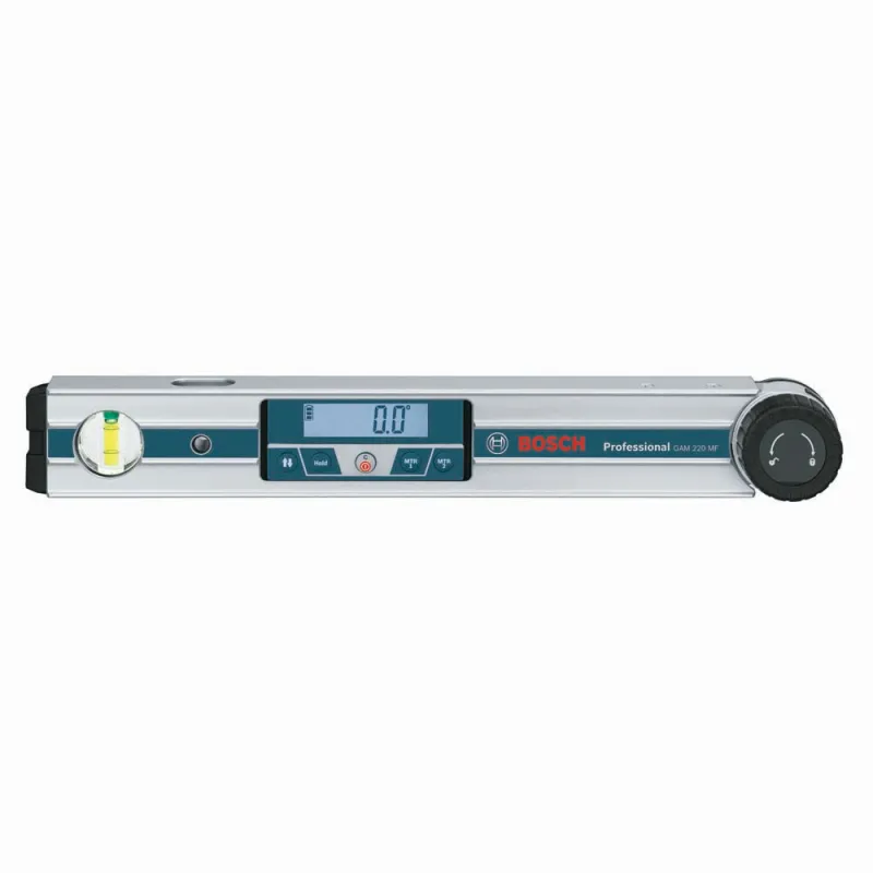 The Bosch GAM 220 MF Digital Angle Finder is four tools in one: an angle finder, a cut calculator, a protractor and a level. The flip display is illuminated and rotating, making it easy to read. The simple miter cut calculation has an input range of 0-220°, and it includes a compound cut calculator. It has clearly labeled buttons for straightforward calculations. This angle finder provides angle memory, to provide the same angle measurement in different areas of the jobsite. The tool has robust housing with IP 54 protection. It’s a perfect tool for carpenters, remodelers and contractors.