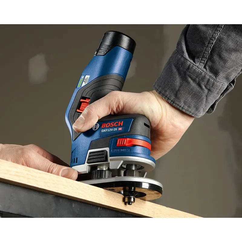 The Bosch GKF12V-25N 12V Max EC Brushless Palm Edge Router delivers cordless freedom and a unique offset design, making this router the choice for comfortable, compact edge routing and trimming The ergonomic GKF12V-25 palm edge router is light weight and balanced. This professional cordless router is designed specifically to make edge routing and trimming easier. It features a unique ergonomic design that has most of the tool and its gripping areas positioned over the workpiece for maximum stability when edge-forming. It weighs only 2.2 Lbs. (tool only, not including battery). The EC Brushless motor helps to provide great runtime. When rounding 0.2 In. of beech, this unit delivers 23 Ft. of routing per battery Amp hour (Ah). It has an easy-change spindle lock, fast macro depth adjustment, and easy fine depth adjustment at 0.04 In. per revolution of the dial. For user protection, it includes a drop-detection sensor that stops the motor if dropped, as well as finger barriers to help prevent contact with the bit area. This is a bare-tool kit; the battery and charger are sold separately.