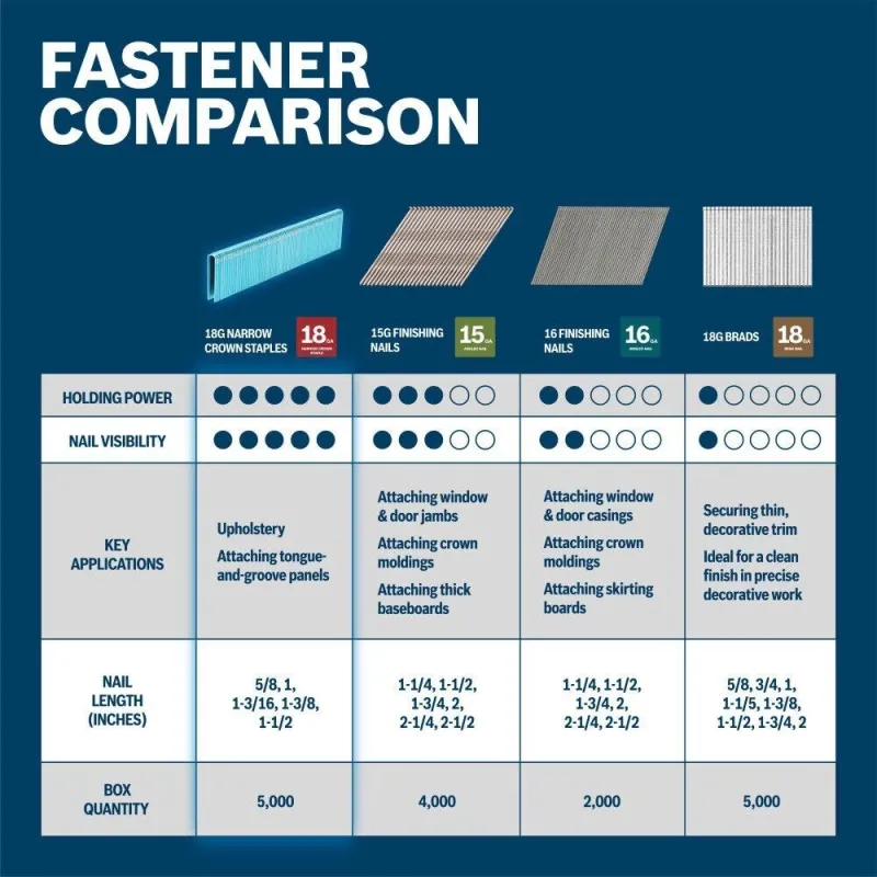 • Universal brand fit– compatible with 18-gauge 1/4 In. narrow crown staplers