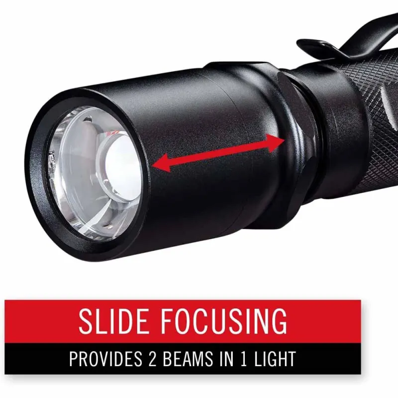• Slide Focus: The SLIDE FOCUS® system allows one-handed control to smoothly adjust the beam shape. Easily switch between spot and flood modes with a simple push or pull, leaving one hand free for other tasks.
