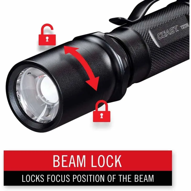 • Beam Lock: COAST’s BEAM LOCK® technology lets you lock the beam in place at any spot or flood setting. Simply twist the light’s head to the left to lock it, and twist it back to the right to release the slide mechanism.