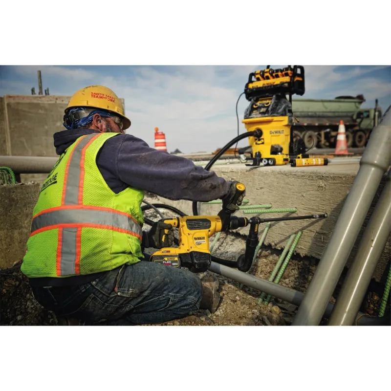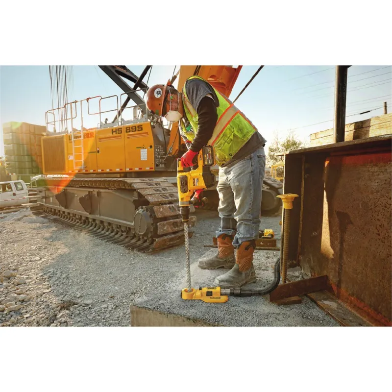 The DCH481B 60V Max Brushless 1-9/16″ SDS Max Combination Hammer is a light weight high-performance hammer that is powered by a DEWALT brushless motor and durable German engineered mechanism. The DCH481 delivers 6.1 joules of impact energy for fast drilling, even in the hardest concrete. The light weight design makes it ideally suited for horizontal serial drilling for #4 – #8 rebar, dry coring and chipping in any mid to upper wall and ceiling application. The patented E-Clutch ® system provides enhanced control to the user in a bind up situation and can help minimize sudden torque reaction compared to standard clutches. The Active Vibration Control® technology employed delivers reduced user vibration for less user fatigue and greater productivity. With its balanced design, SHOCKS® Active Vibration Control® technology and Extreme Run Time, this hammer is ideally suited for all day use, even in the hardest concrete.
