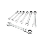 This 7-piece ratcheting flex head combination wrench set (SAE) is made with chrome vanadium steel for added strength and durability. The wrenches include stamped markings for easy wrench size identification.
