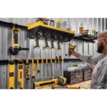 The DEWALT 24in Wire Shelf is part of the DEWALT Workshop Storage System and mounts directly to DEWALT Metal rail. Multiple shelves can be used together to create a longer, continuous surface. It is constructed of heavy-duty steel that can support up to 35 lbs. It also features a patented latching system that secures the hook to the rail.