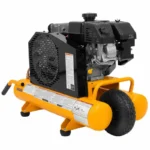 For your next framing or roofing project, look to this DEWALT 8 Gal. Kohler gas driven air compressor (DXCMTE6590811) The Kohler SH270 OHV gas engine delivers up to 11 SCFM at 90 psi for excellent tool performance. This air compressor features a durable cast iron twin cylinder high-output pump and a convenient integrated control panel equipped with a high flow regulator. With the twin tank wheelbarrow design and a 10 in. center mount turf tread never-flat tire, you can move this compressor quickly. This DEWALT gas powered wheelbarrow air compressor is capable of tackling even the most demanding job site conditions.