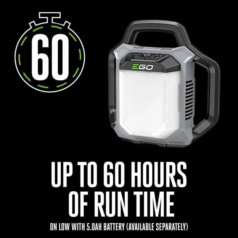 The EGO POWER+ Compact Area Light delivers color temperature control from 2700K to 5000K to fit the ambiance and functionality needs of your space. Dial in a temperature near 2700K for a warm light to help keep bugs away when relaxing or entertaining, or push it to a cooler, whiter 5000K resembling daylight for task-oriented lighting needs. The Compact Area Light has adjustable brightness up to 3,000 lumens and delivers up to 60 hours of runtime on low with a 56V 5.0Ah ARC Lithium™ battery (available separately). It can mount on a tripod, hang from its rafter hook, or rest in a variety of orientations to deliver versatile lighting configurations. Its IPX4-rated weather resistance allows the area light to be used in adverse weather conditions.