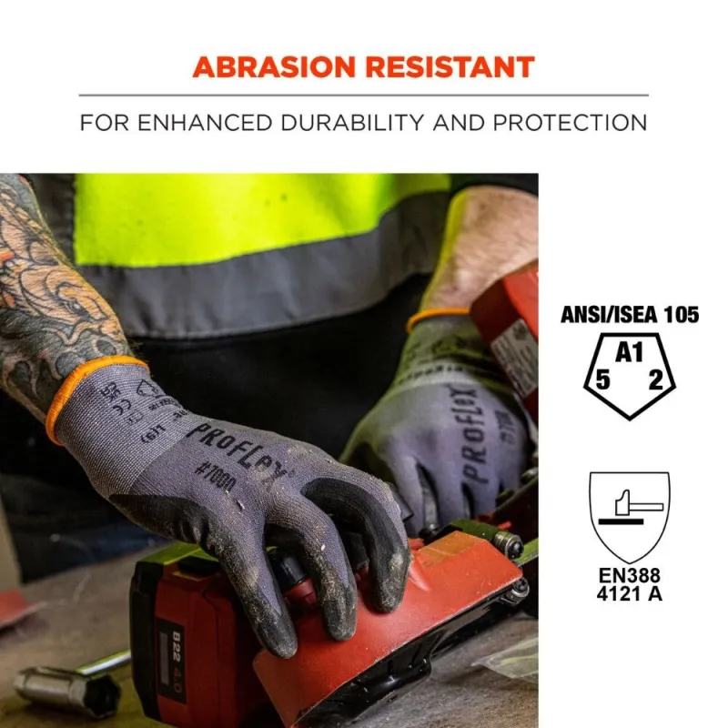 The ProFlex 7000 Nitrile Coated Gloves feature microfoam nitrile coated palms for excellent grip and dexterity with an ultra-lightweight and soft form fit. The 15-gauge nylon-spandex knit is comfortably lightweight and flexible while still meeting ANSI level 5 abrasion resistance for long lasting durability. The snug knit cuffs are longer than most on the market, a feature that enhances fit and extends protection while keeping dirt and debris out.