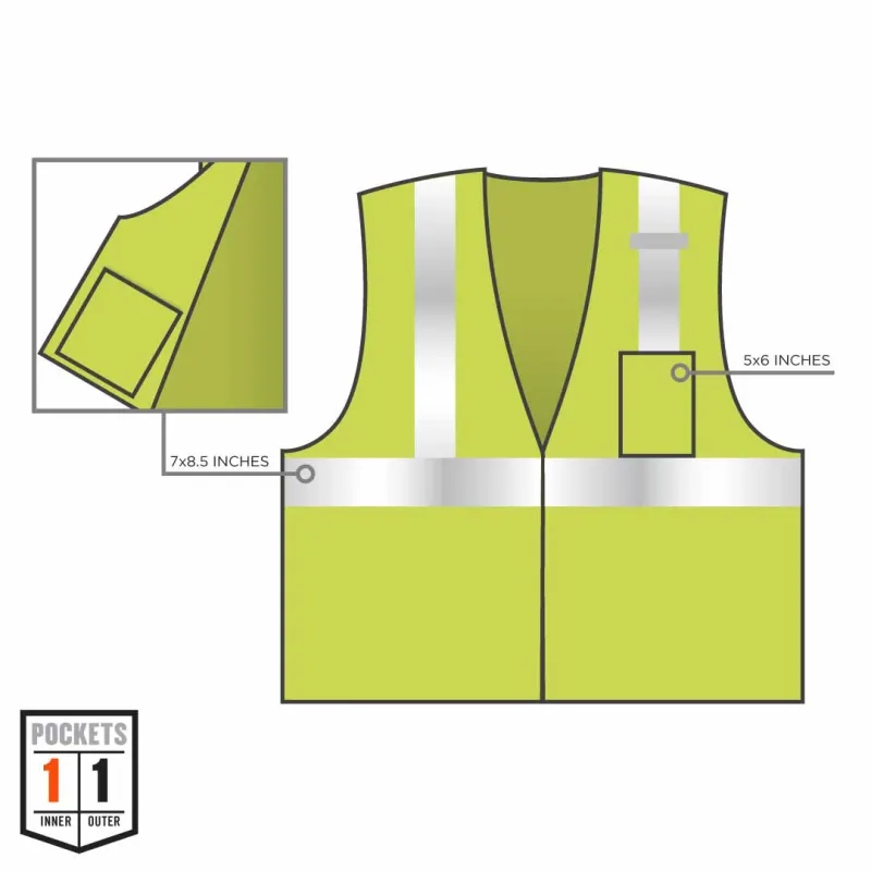 Class 2 Economy Vest: Mesh fabric, inside pocket, outside pocket. Zipper closure.