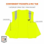 Included in the vest are one interior pocket, one dual pen pocket and a single flame-resistant radio mic tab. There is D-ring access on the back for wearing over fall protection harnesses, and a hook & loop closure for easy on/off.