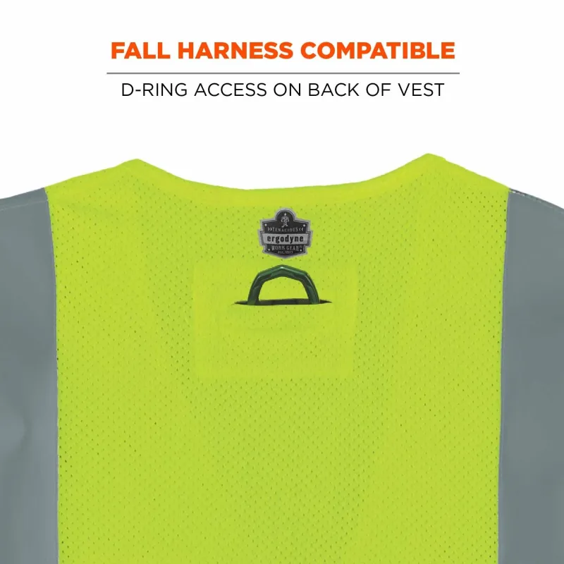 - EASY ON/OFF – FR hook & loop closure with D-ring access on back of vest for wear over fall protection harnesses
