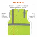 This vest is available in single sizes to allow workers to order their exact size for a more tailored, performance-style fit compared to dual-size vests (*tip: for best single-size fit, select one size down from your normal T-shirt size). The 8210HL Hi-Vis Safety Vest is our identical dual-size model for those who prefer a looser fit for wear over sweatshirts or jackets.