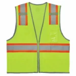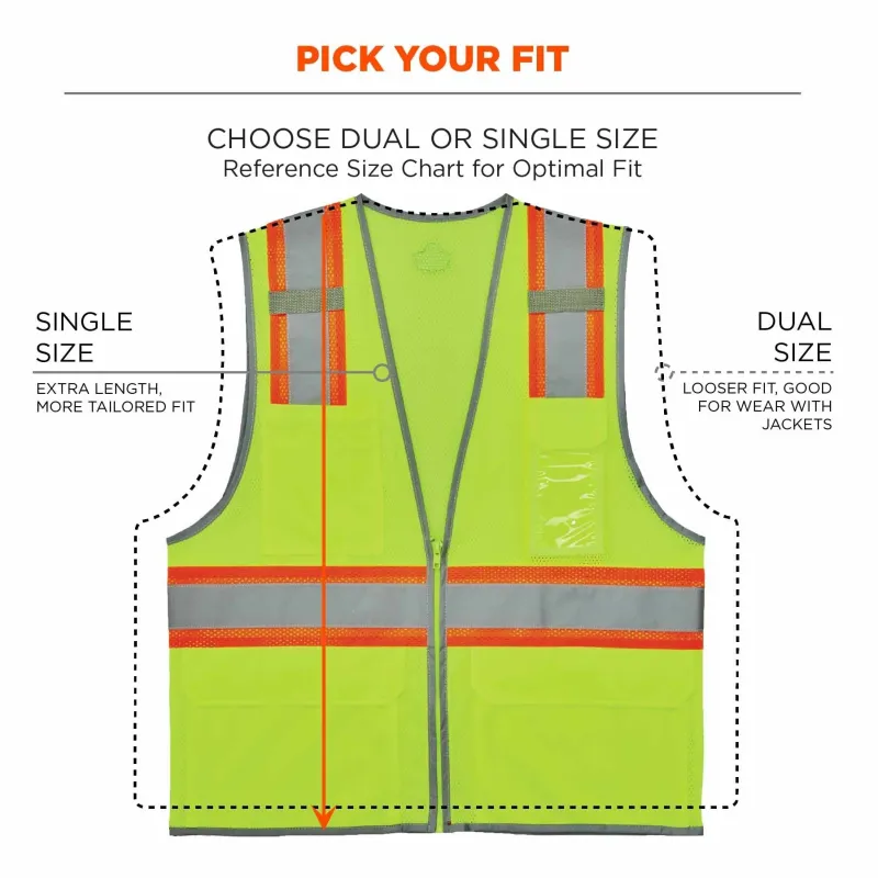 This vest is available in single sizes to allow workers to order their exact size for a more tailored, performance-style fit compared to dual-size vests (*tip: for best single-size fit, select one size down from your normal T-shirt size). The 8246Z Two-Tone Hi-Vis Safety Vest is our identical dual-size model for those who prefer a looser fit for wear over sweatshirts or jackets.