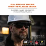 Skullerz OSMIN Safety Glasses feature an Over-the-Glasses (OTG) wrap-around lens for a wide field of vision and seamless fit over prescription frames. These safety glasses feature polycarbonate lenses to protect against impacts and filter 99.9 percent of harmful UVA, UVB and UVC rays. The frame features a nylon and soft rubber design for added durability and flexibility, while a molded-in brow guard and side shields provide enhanced protection from debris. Integrated brow venting enables airflow for all-day comfort. To provide a custom fit on a variety of faces, the rubber temples can be easily bent and re-bent for a custom, secure fit. Built-in soft rubber guards on the frame and temples protect prescription frames and lenses from constant movement and harmful scratching that can occur with some over-the-glass safety glasses.