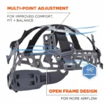 • BREATHABLE – Adjustable venting and flexible open frame with 6-point suspension improves air circulation