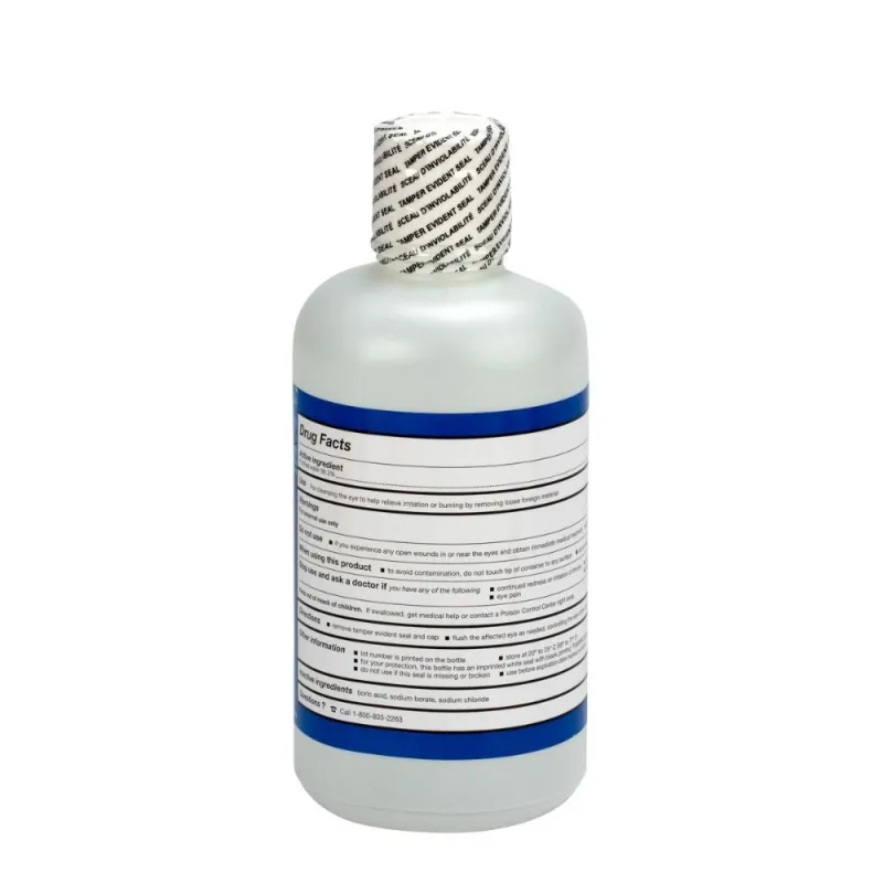 - Bottle of sterile isotonic buffered solution for washing and flushing and irrigating the eyes and skin.