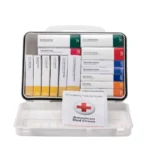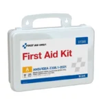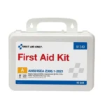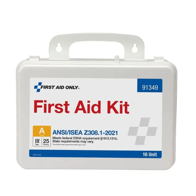 This 25 Person ANSI 2021 Class A First Aid Kit is designed for small offices, vehicles, or worksites, featuring a weatherproof plastic case and 83 essential pieces.