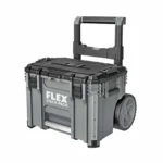 Roll everything you need to and from the jobsite with the FLEX STACK PACK™ Rolling Tool Box. Its removable telescoping handle allows for easy transport in a covered truck bed, and you can tackle any terrain with its 9-inch rugged wheels. Gas struts aid opening and closing of the lid, and keep it propped open securely for continuous access when needed. IP65 all-weather protection shields your tools and accessories from the elements, and an impact-resistant polypropylene body with aluminum reinforced corners offers protection from the toughest jobsite conditions. Best of all, quick-connect interlocking attachment points offer fast and effortless connectivity to customize your layout with any piece in the STACK PACK™ storage system so you can build a rolling workshop packed with everything you need for a day on the job.Protected by a one-year limited warranty when registered within 30 days of purchase at registermyFLEX.com.