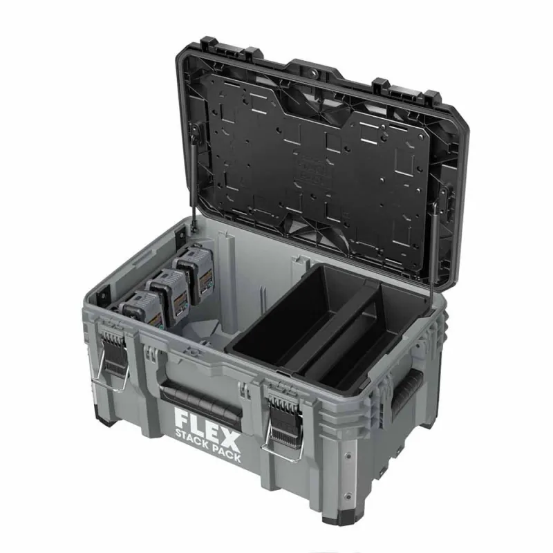 Pack everything you need for a day on the job with the FLEX STACK PACK™ Medium Tool Box. A metal-reinforced top cantilever handle allows you to confidently carry your tools to and from the jobsite, and two-piece durable locks ensure the lid stays closed securely. Load, offload, and maneuver the box easily from any angle with front and side grab handles. IP65 all-weather protection shields your tools and accessories from the elements, and an impact-resistant polypropylene body with aluminum reinforced corners offers protection from the toughest jobsite conditions. Quick-connect interlocking attachment points offer fast and effortless connectivity with any piece in the STACK PACK™ storage system so you can custom build your layout for the ultimate traveling workshop.Protected by a one-year limited warranty when registered within 30 days of purchase at registermyFLEX.com.