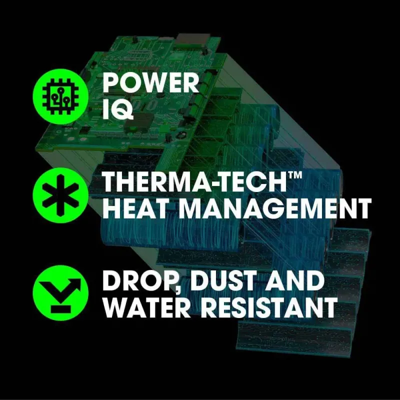 - THERMA-TECH™ HEAT MANAGEMENT – Innovative cooling system minimizes heat for 25% longer runtime