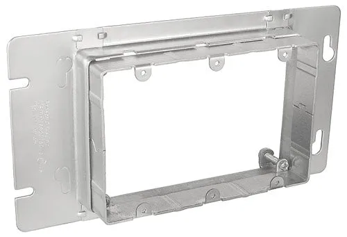 Adjustable 3/4-in to 1-1/2 inch raised for use with mating three gang boxes. These covers are used in ceilings walls and floors when finished surface depth is unknown or in question. They allow a perfect flush installation to finished surfaces ensuring that devices are securely fastened and well grounded to rings. Their telescoping three gang inner ring adjusts to finished wall surface for a perfect fit every time!