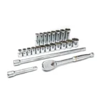 The 80707 is a 23 piece 1/2-in drive 6 point SAE mechanics tool set that includes both standard and deep length sockets. This set includes: 12 standard length SAE sockets ranging from 7/16-in to 1-1/8-in, 8 deep length SAE sockets ranging from 1/2-in to 15/16-in, an 84 tooth standard ratchet, and a 5-in and 15-in extension. The set comes with a blow mold storage case. Sockets and drive tools are full polish chrome and the sockets feature off-corner loading that reduces fastener rounding.