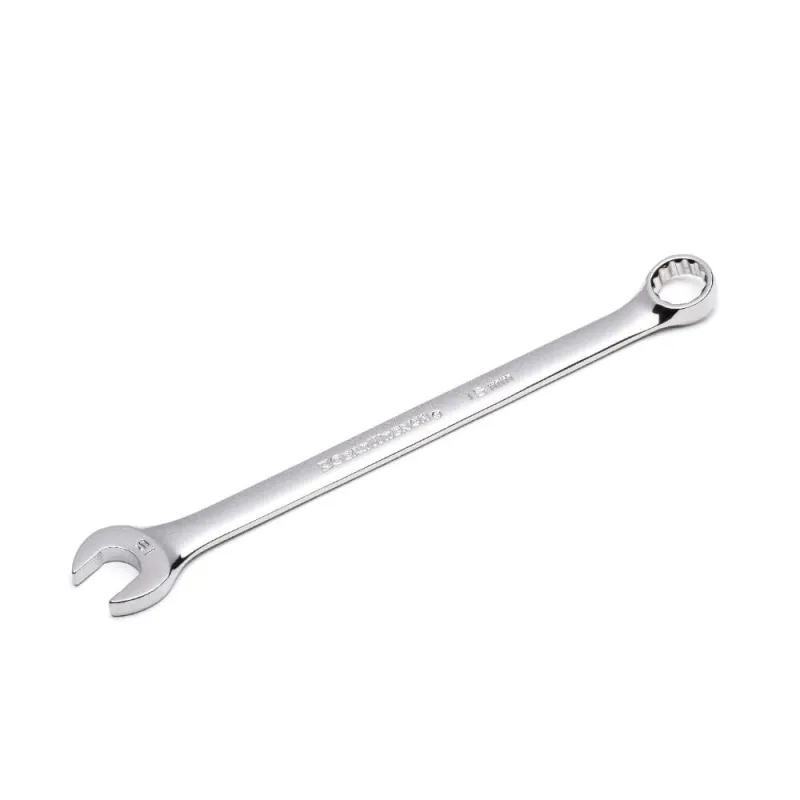 The GEARWRENCH combination wrenches are a durable, made from alloy steel with a bright, full polish finish. The off-corner loading design on both ends provides a stronger grip on fasteners, reduces fastener rounding, and delivers up to 25% more torque to the fasteners. Sizes are stamped on the open end head, as well as the beam for quick and easy identification. The box end is offset 15° for increased access to fasteners. The 81902 is a 15 piece 12 point, metric long pattern set including sizes 8 mm to 22 mm. The set comes with a V rack for storage and organization.