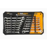 • Included tray for storage and organizationThe GEARWRENCH ratcheting combination wrenches are the original patented ratcheting wrench! The ratcheting box end is designed to need as little as 5° to move fasteners versus 30° for standard wrenches. The wrenches are made from strong alloy steel with a bright, full polish chrome finish. The ratcheting box end features off-corner loading for a better grip on the fastener and reduces fastener rounding. They’re available in various lengths and styles, including: XL length, stubby, flex, stubby flex, and locking flex.