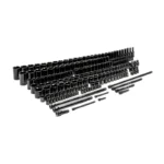 The GEARWRENCH 80972 209 Piece ¼” Drive, 3/8” Drive, ½” Drive SAE & Metric, Standard & Deep, 6 Point Impact Socket Master Set, provides the full range of sockets and impact drive tool accessories to cover a full range of fastener sizes from 3/16” – 1-1/2” & 4mm – 36mm. All of the 6-point standard and deep impact sockets within the set feature high-visibility laser-etched markings and secondary hard stamped size markings provide quick size identification. The SAE and metric sockets are made from Chrome molybdenum alloy steel (Cr-Mo) for exceptional strength and durability, have a manganese phosphate finish to resist corrosion with off-corner loading design to reduce fastener rounding. The sets impact drive tool accessories include: impact universal joints, to provide angled access to more fasteners, impact extension bars, to provide additional reach and access to more fasteners, and impact adapters, allowing the impact drive tools to work with additional drive size of sockets.