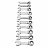 The GEARWRENCH combination ratcheting wrenches feature a 5 degree ratcheting arc vs. 30 degree on a standard combination wrench increasing productivity. The wrenches feature off-corner loading for better grip and reduced fastener rounding. The wrenches have a sleek head design allowing access to tight spots where a ratchet would not fit. The 9520D is a 10 piece metric stubby set including sizes 10 mm to 19 mm.