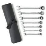 The reversible ratcheting combination wrenches from GEARWRENCH are a staple for every tool box. The flush-mounted reversing lever allows the user to switch motion left to right without needing to remove the wrench from the fastener which increases productivity. The 15° offset on the ratcheting box end allows for greater knuckle clearance and safer access to the fasteners. The ratcheting box end is designed to need as little as 5° to move fasteners versus 30° for standard wrenches and features off-corner loading for a better grip on the fastener and reduces fastener rounding. . The wrenches are made from a strong alloy steel with a bright, full polish chrome finish. The 9567RN is a 7 piece sae set that includes sizes 3/8 in. to 3/4 in. and comes with a tool roll for storage and organization.