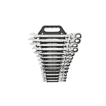 The 9702D is a 13 piece 12 point flex ratcheting combination wrench set that includes 5/16 In. to 1 In. size range. Flex head tilts up to 180 degrees at any interval and features off-corner loading for a better grip and reduces fastener rounding. Adjustable set screw allows you to set desired head tension with spring washer design providing continuous head tension. Ratcheting box-end needs as little as 5 degrees to move fastener VS. 30 degrees for standard box end wrenches. Serrated wrench beam allows you to feel which way to pull.