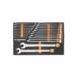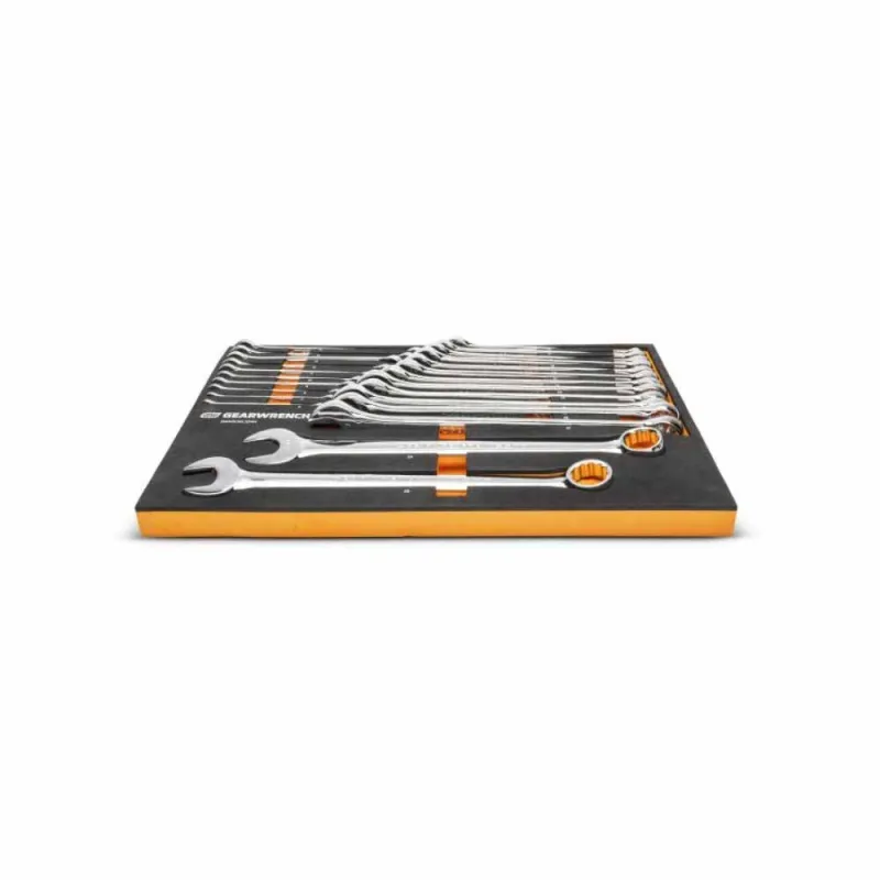 GEARWRENCH mechanics tools have been designed with professional users in mind for better productivity, access, and strength. The 24 piece 12 point long pattern combination metric wrench set in a foam storage tray is one of the wide collection of GEARWRENCH Modular Sets. These chemical and solvent resistant foam trays are designed to fit in a wide range of tool storage systems, including our GSX storage line of products. The foams are in contrasting orange and black with high visibility size markings for easy tool identification. Each of the tools fits in a custom cutout that provides optimal protection, organization, and accessibility.