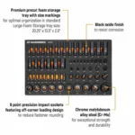 • Includes premium precut foam storage tray with high visibility size markings for organization