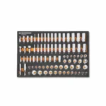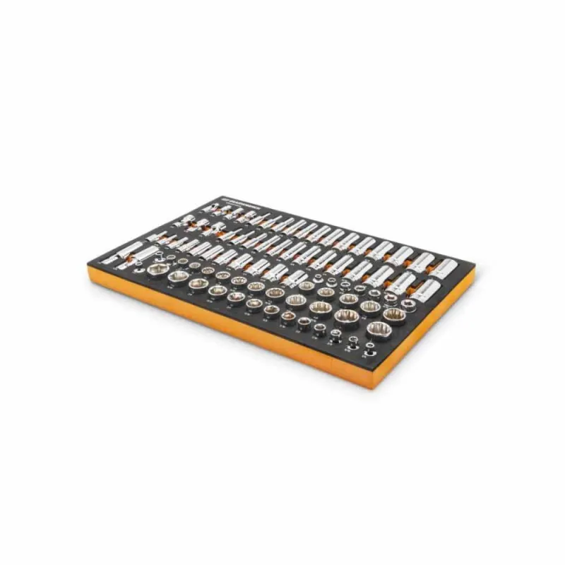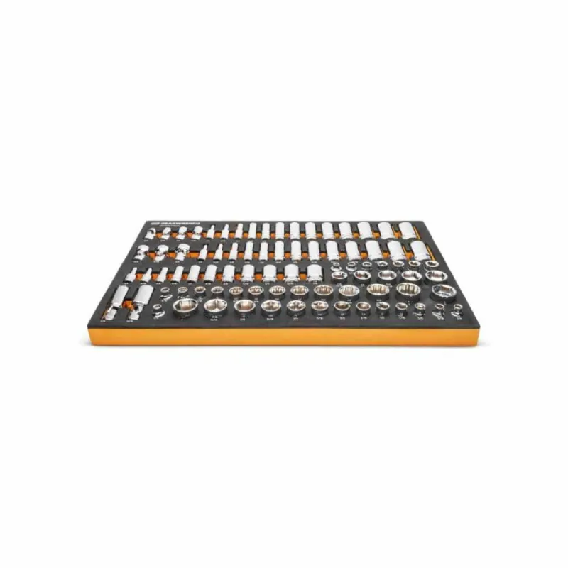 GEARWRENCH mechanics tools have been designed with professional users in mind for better productivity, access, and strength. The 85 piece 3/8” drive master metric socket set in a foam storage tray is one of the wide collection of GEARWRENCH Modular Sets. These chemical and solvent resistant foam trays are designed to fit in a wide range of tool storage systems, including our GSX storage line of products. The foams are in contrasting orange and black with high visibility size markings for easy tool identification. Each of the tools fits in a custom cutout that provides optimal protection, organization, and accessibility.