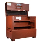 Crescent JOBOX is the leader in on-site storage security, organization, and safety with its high-strength, chamfered lid, commercial gas springs* for lid control and its Site-Vault™ security system. 4-way EZ-Loader skid bolsters and slip-resistant textured powder paint help provide safety and handling ease.
