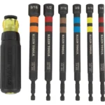Klein Tools’ 1/4-Inch Hollow Magnetic Color-Coded Power Nut Driver was designed with the professional in mind. The 3-3/4-Inch (9.5 cm) hollow core facilitates work on threaded rod by enabling easier access to nut. Made of high-grade impact steel and is color-coded for easy identification. The nut driver contains Rare-Earth magnets to securely hold fasteners, and is also extra long for greater reach.