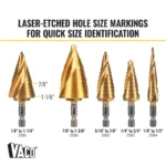 Dual Spiral Flutes on VACO Step Drill Bits help pull the step bit through material for faster cutting. The Titanium Nitride coating extends the life of the cutting edge. Convenient to use with an impact driver and drill, the 1/4-Inch hex shank provides a firm, positive grip. Available in five step bit sizes with commonly used hole sizes for steel (up to 16 gauge), plastic, aluminum, and wood.