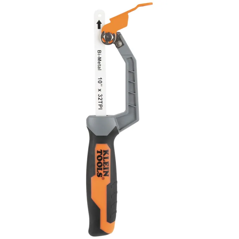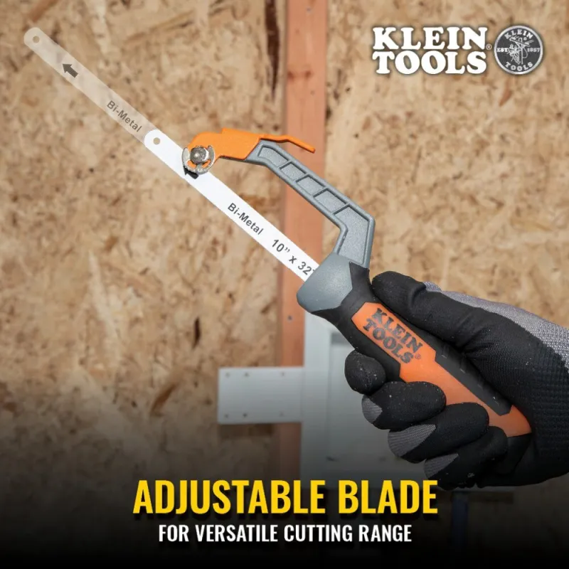 The Klein Tools Compact Finish-Cut Hacksaw is designed to cut most plastic, wood, and thin wall metal tubing. The saw has a 10-Inch by 32 TPI bi-metal hacksaw blade that is easy to adjust and exchange by engaging the tool-free lever. The fine-grade design allows for faster deburring and smooth cuts.