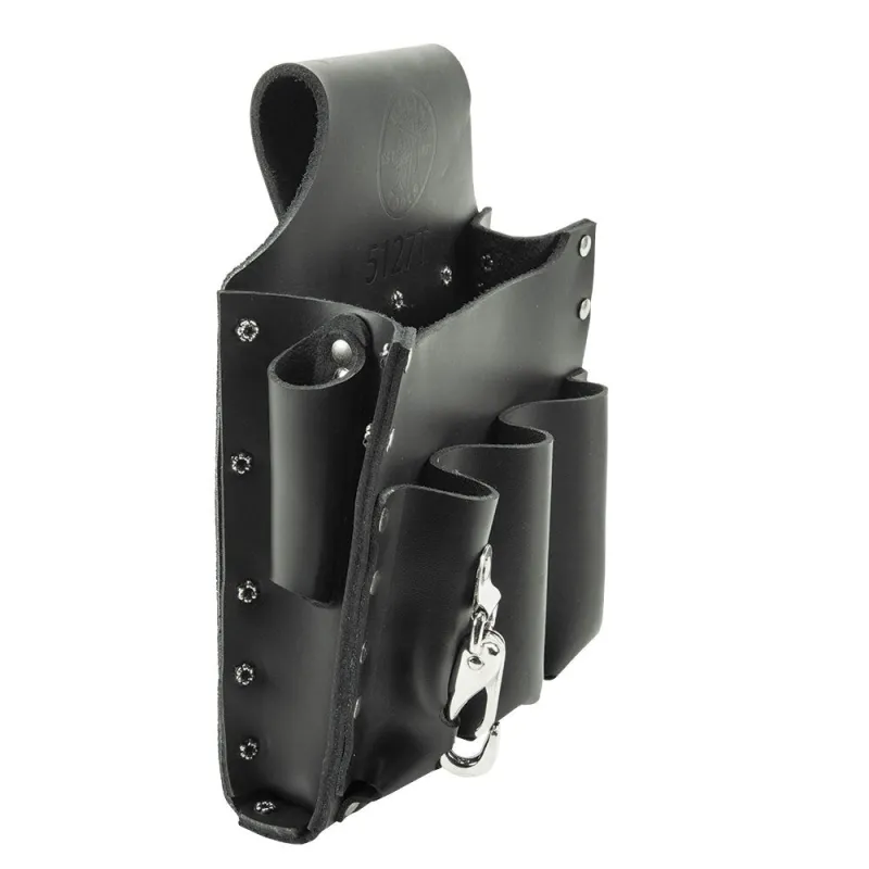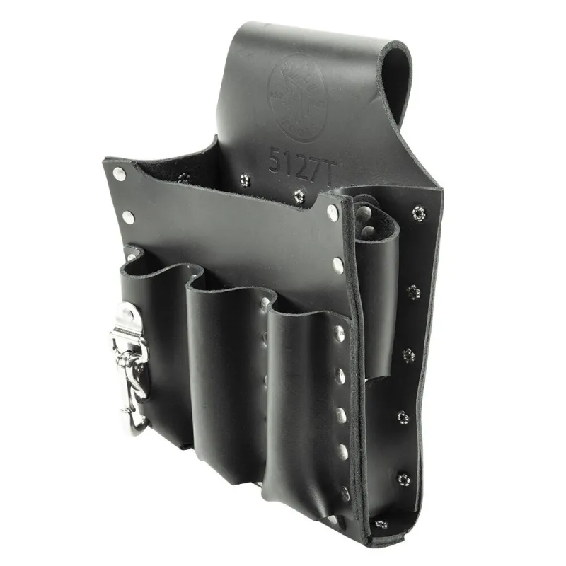 The Klein Tools 6-Pocket Tool Pouch features rivet-reinforced leather for durability with a loop for attaching the pouch to a belt for convenient access to tools on the job.