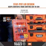 Klein Tools MODbox™ Short Component Box, Half Width comes with 4 removable storage bins and a stay-put lid design to keep contents from shifting. The clear lid provides an easy view of contents such as wire nuts and fasteners. Component box is IP65 rated and made with impact resistant polymers. Easily connects with other MODbox™ components to make a custom mobile workstation.