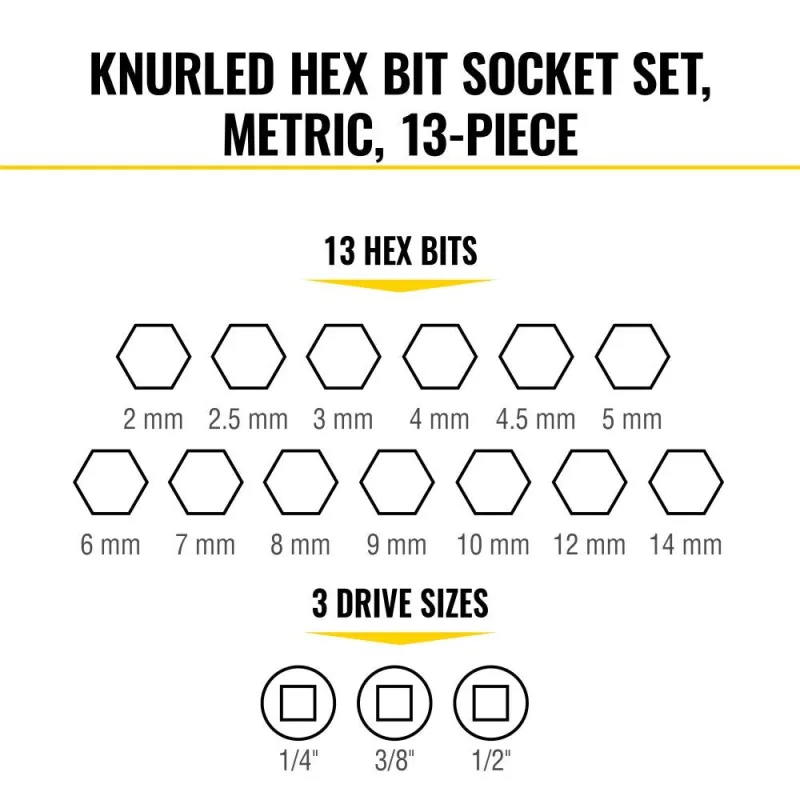 The Klein Tools 13-Piece Knurled Hex Bit Socket Set features 1/4, 3/8, and 1/2-Inch drive metric hex bit sockets that are optimized for driving applications. Knurling at base of socket allows for greater grip when starting fasteners by hand. It contains the most common metric hex bit sizes.
