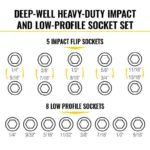 • Five deep well, color-coded, impact flip sockets, eight color-coded low profile sockets, and six adapters for maximum flexibility