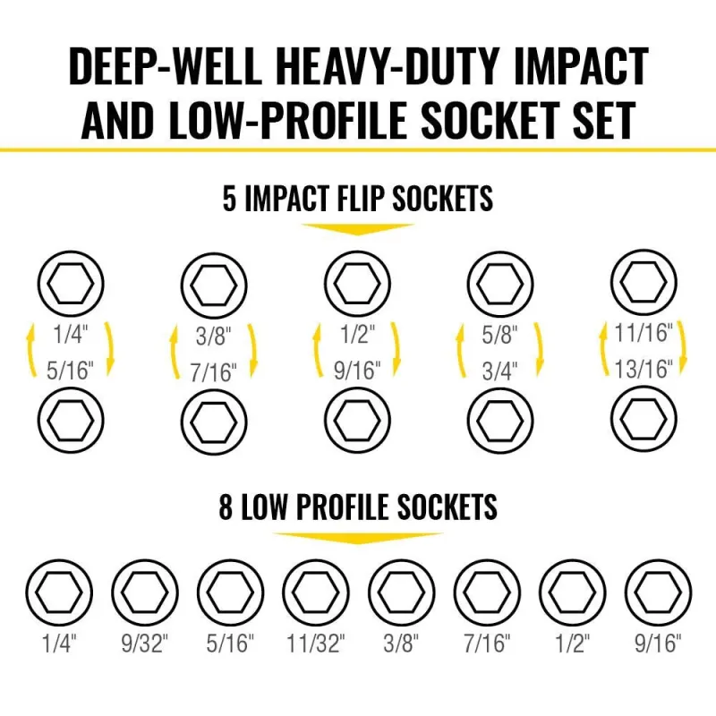 • Set includes a pass through ratchet, 1/4 x 5/16, 3/8 x 7/16, 1/2 x 9/16, 5/8 x 3/4, and 11/16 x 13/16 inch deep well sockets, and 1/4, 9/32, 5/16, 11/32, 3/8, 7/16, 1/2, 9/16-Inch low-profile sockets