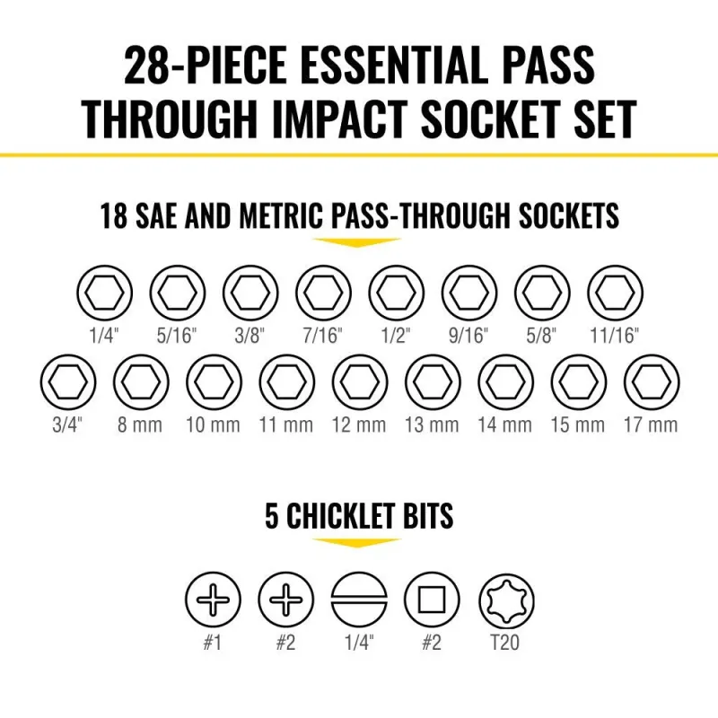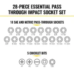 The 28-Piece Essential KNECT™ Pass Through Impact Socket Set features a 90-tooth pass through ratchet and Cushion-Grip™ pass-through handle for driving hex nuts on extended threaded rod. The 1/4-Inch square drive adapter allows for use with traditional sockets. Set includes 18 SAE and metric hex bits, 4 adapters, 5 chicklet bits, pass through handle, and socket wrench.