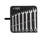 This Klein Tools 7-Piece Combination Wrench Set includes seven of the most popular wrench sizes. Each wrench has an open-end and a box wrench, both with the same size opening. This set also comes with a pouch that has marked pockets for each wrench and hanging grommets.