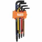 Klein Tools’ 9-Key Color-Coded Hex Key Set conveniently consolidates the most popular SAE sizes into one compact caddy. The industrial strength, extended reach ball-end keys are optimal for working at angles up to 25 degrees. The round shanks with plastic sleeve provide enhanced comfort during prolonged use.
