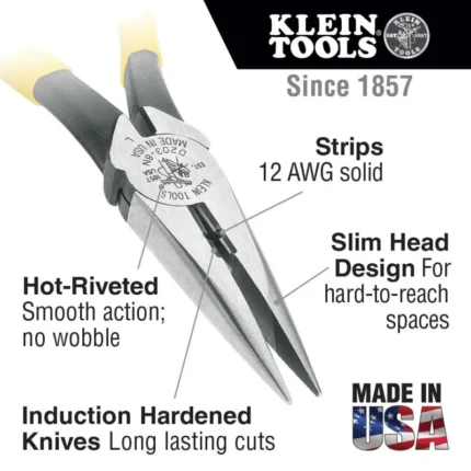 These Long-Nose Side-Cutters are spring-loaded for self-opening. The cutting knives are induction hardened for maximum life. Made of forged steel for durability with a long nose for grabbing and looping wire.